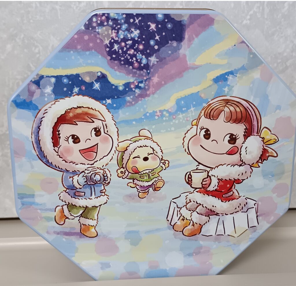 ペコ・ポコ・ドッグが冬を楽しむ様子が描かれた幻想的なデザインの缶に、