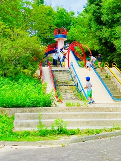 その他にも、遊戯広場には大きな滑り台や、ブランコ、鉄棒などおなじみの公園遊具もあり、小さなお子さんから小学生高学年までが、暑い中でも元気いっぱい遊んでいましたよ。