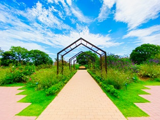 ローズガーデンのメインスポットには、「黄金のローズアーチ」があり、アーチ突き当たりにあるベンチでは、満開の季節には黄金色の花に包まれながら一休みできるとか。