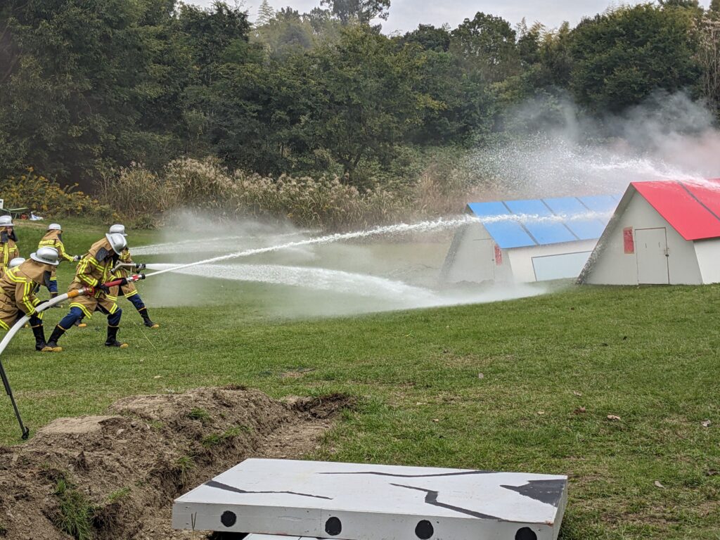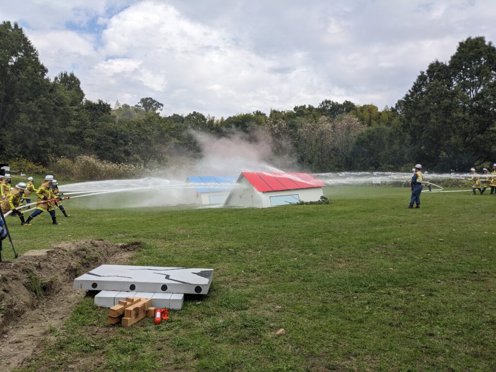 救助応急救護訓練などがあり、最後には蓮間池の水を使用した