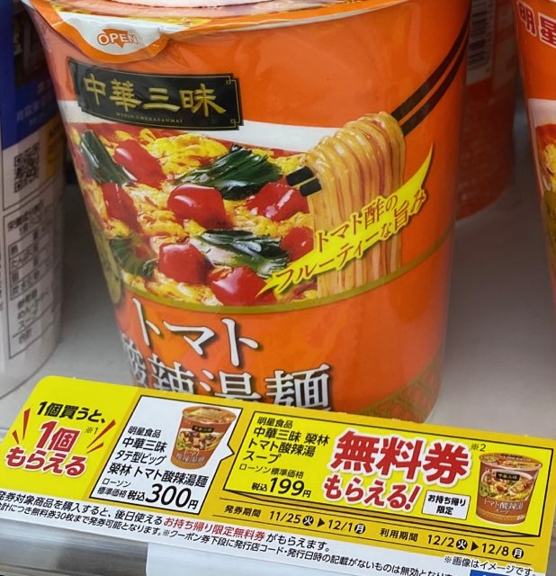 明星からは中華三昧カップ麺「トマト酸辣湯麺」が発売されています。
